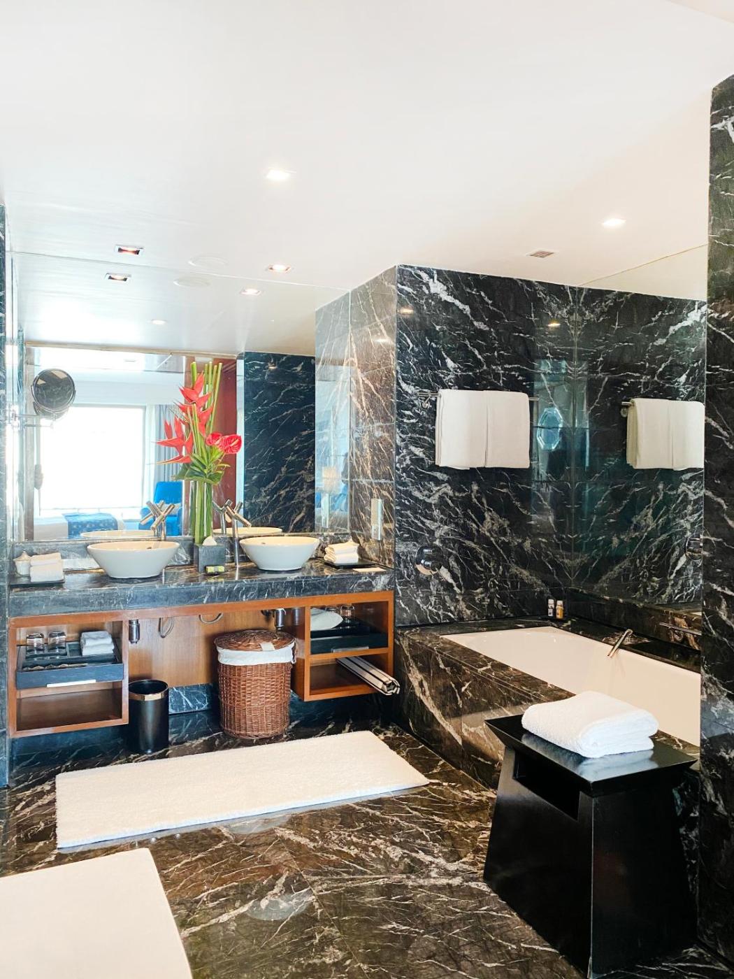 One-Bedroom Suite with Sea View. Opulent 900 Sq.feet Suite with 3 side Panoramic Sea View and 24Hr Butler Service on request. These are the Largest Rooms in the city with Bathtub in each room along with Twin Sinks and separate shower Area and walk in Wardrobe. Complimentary Wi-fi with 49in Smart TV in each room. Luxurious Bath amenities and Aromatherapy on Request. Rooms are non- smoking. ;